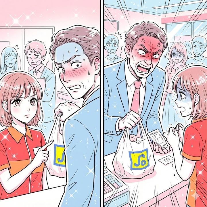 男性は「は?」と口を開け、持っていたレシートと袋、そして私の制服を見比べました。
