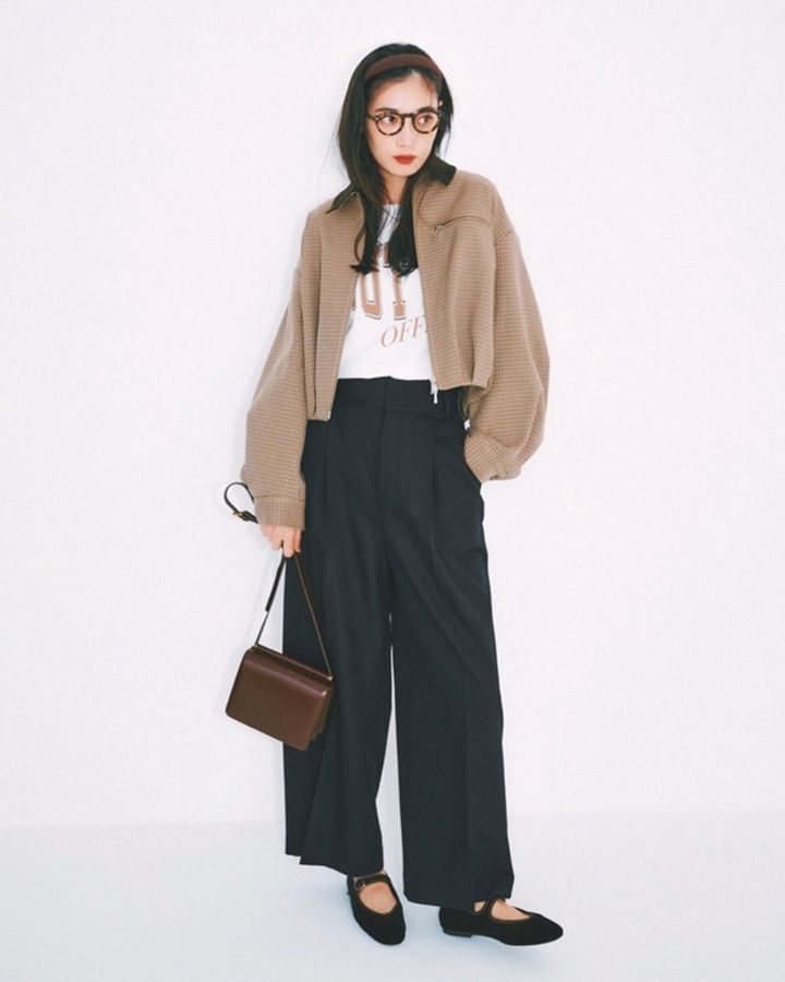ブルゾン¥39,600 Tシャツ¥14,300(ともにバウム・ウンド・ヘルガーデン╱アルアバイル)パンツ¥28,600(アンクレイヴ╱オンワード樫山 お客様相談室)バッグ¥33,500(トゥティエ)シューズ¥18,700(オデット エ オディール╱オデット エ オディール 新宿店)カチューシャ¥26,400(アレクサンドル ドゥ パリ╱アレクサンドル ドゥ パリ GINZA SIX店)めがね¥42,900(アイヴァン╱アイヴァン 東京ギャラリー)ネックレス¥15,180(ベン・アムン╱ZUTTOHOLIC)