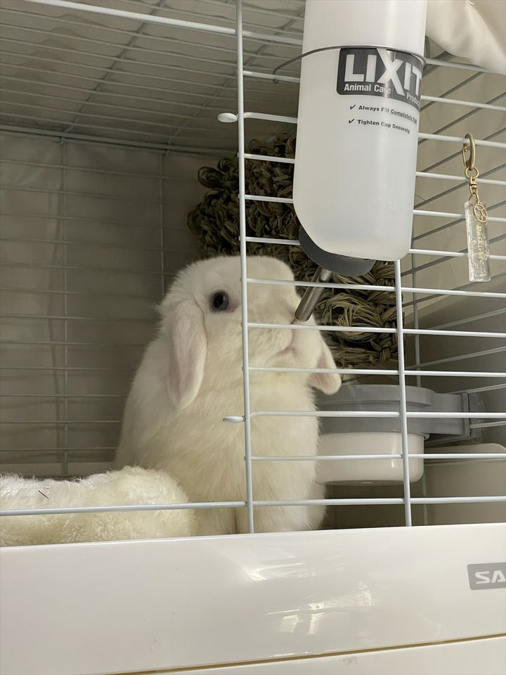 こちらは、ホーランドロップの『大吉(だいきち)』くん。 目の前にある給水器から水を飲むか飲まないかをずっと悩んでいるのだとか。 しかも、既に3分を経過しているとのこと。