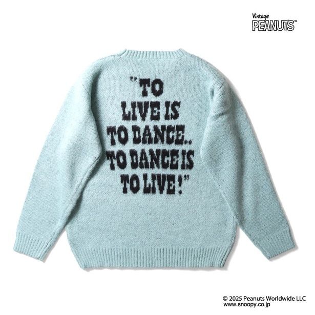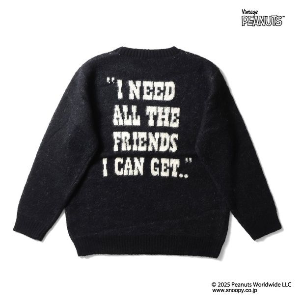 フロントにはキャラクター、バックにはそのキャラの名言があしらわれた、ヴィンテージスウェットを思わせるアートワークが、ジャガード織りのニットで表現されているのが最大の特徴。ふわふわと柔らかな風合いのモヘアウール混で、温かみのあるムードに仕上がっている。
