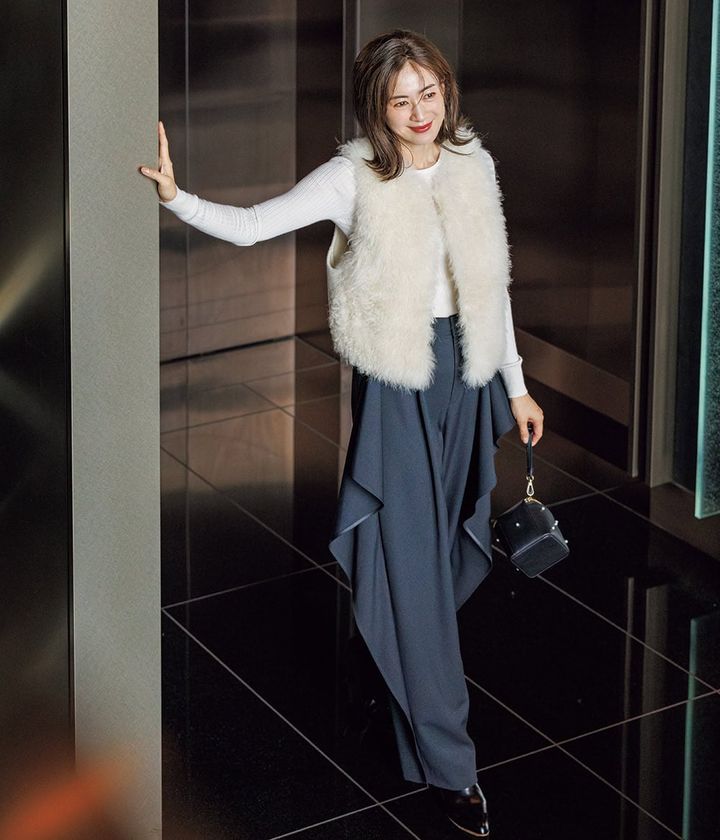 フリルシルエットが印象的な注目パンツ。1枚でエレガント×モードが演出できる逸品。ジレはファーデザインが際立つよう、あえて短めを選んで。