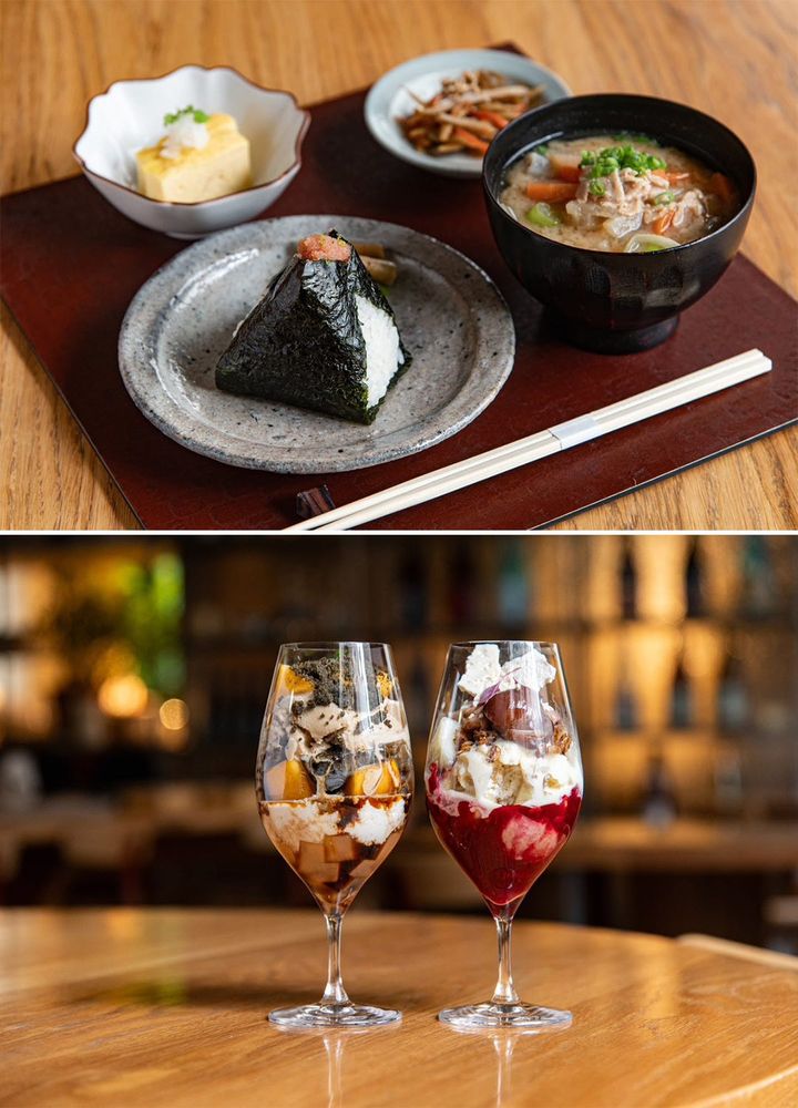 いちおしは、土日・祝日のランチタイム限定で展開している「おむすび定食とパフェのセット」(¥3,000)。「クリームチーズ明太子、すだち」や「焼き鯖とザアタル」から選べる2種のおにぎりと小鉢や副菜、汁物に加え、〆パフェまで味わえるセットは、満足感たっぷり。