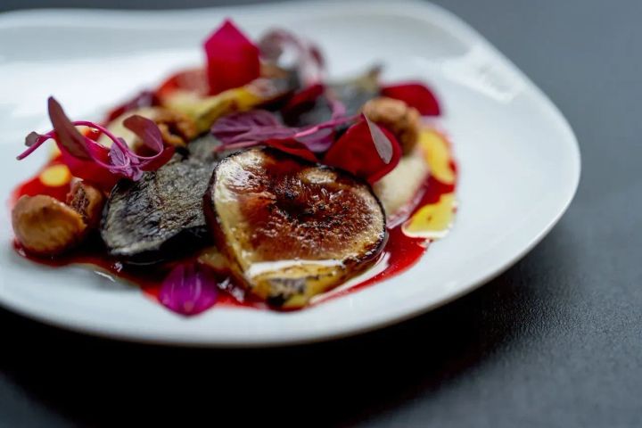 地中海の伝統料理「ババガヌーシュ」を再構築した「薪火焼き茄子とイチヂクのババガヌーシュ」は、特におすすめの一品。やわらかな燻香を纏ったうま味あふれる茄子と、ほんのり甘いドライいちじくのハーモニーを堪能しよう。