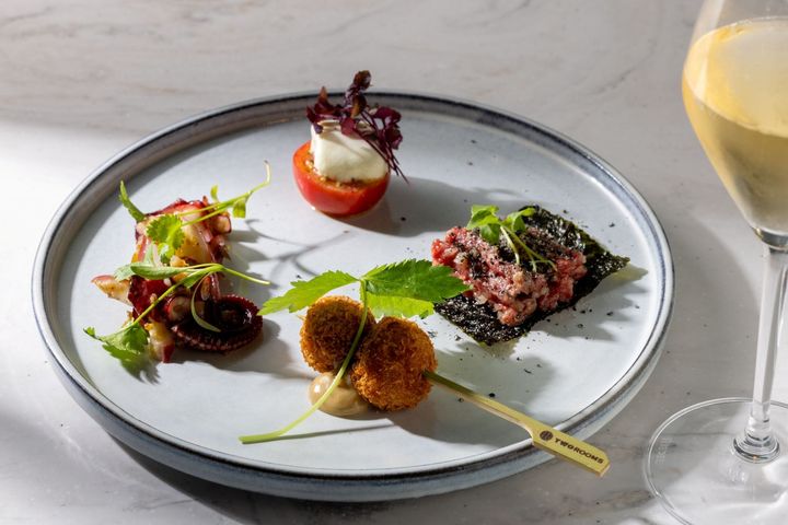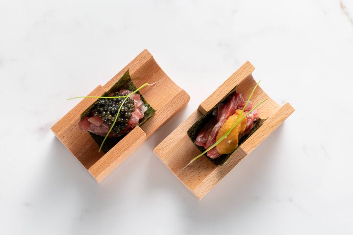 アラカルトメニューにも注目。「山形牛 ユッケタルタル & 根室うに」(¥1,550)や「中トロ & キャビア」(¥1,750)の2種をそろえた「海苔ラップ」、「鮟肝パテ × 紫蘇 × サワードゥクリスプ」(¥1,400)など、日本独自の食材の魅力を引き出した創作料理も実は豊富だ。
