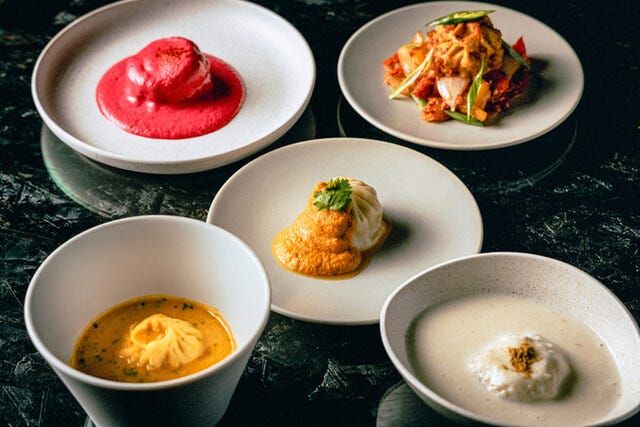 グルメなメンバーが集う忘年会・新年会なら、進化系ネパール料理が味わえる「MOMO Stand Tokyo 2nd(モモ スタンド トウキョー セカンド)」をセレクトするのがおすすめ。2025年7月に西新宿にオープンしたこちらは、広尾で人気を誇るネパール料理店「MOMO Stand Tokyo(モモ スタンド トウキョー)」の2号店だ。