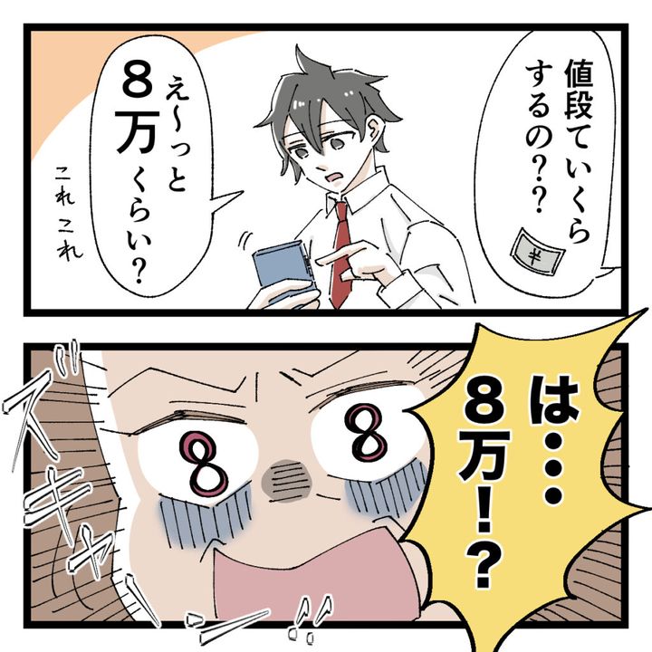 「値段ていくらするの?」と念のため聞いてみると、ショウは「え~っと、8万くらい?」とさらりと言いながら「これこれ」とスマホを見せてきました。「は・・8万!?」想像していたよりもはるかに高い金額に私は思わず叫んでしまいました。
