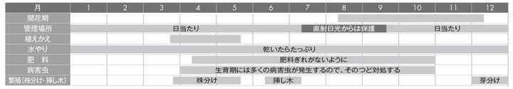 新芽が伸びだす3月下旬~5月中旬に株分けを兼ねて行います。開花終了後、株元に冬至芽が発生するので、12月に芽分けをしてもよいでしょう。
