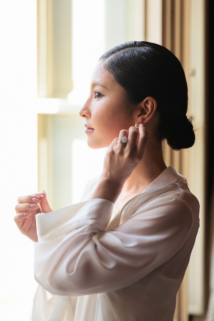 ジュエリーはドレスが引き立つように耳元だけに。リングも際立ちます。