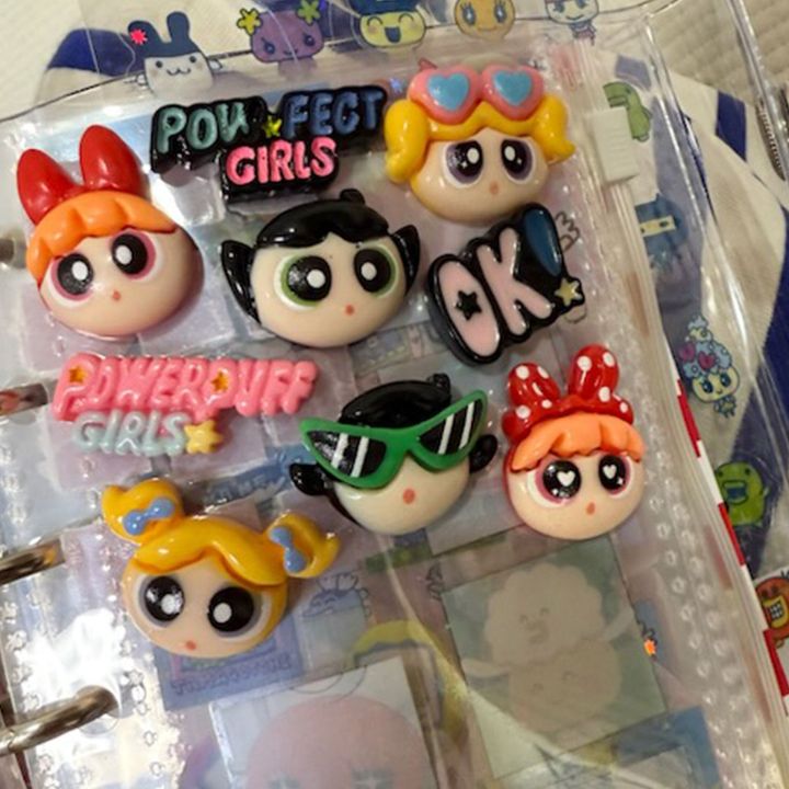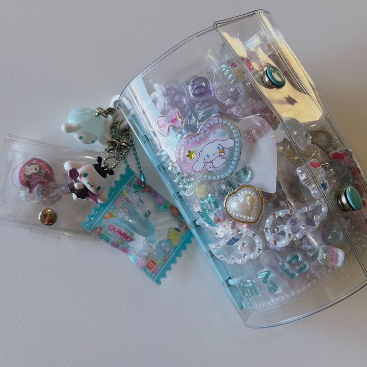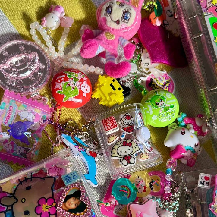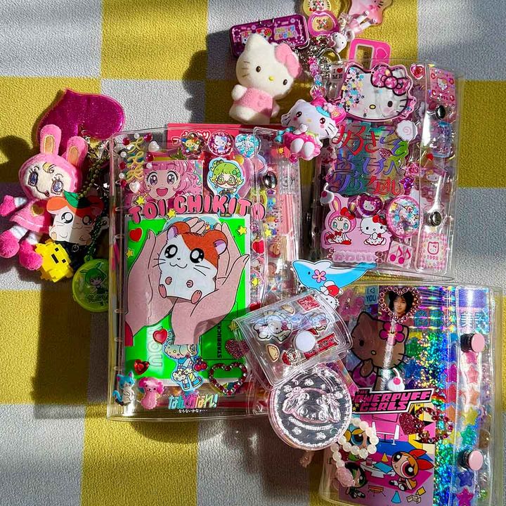 〈エスターバニー〉の小物入れはふわふわで可愛い!〈パワーパフガールズ〉のキーホルダーはガチャガチャで当たりました。ミニミニアルバムはシーインで購入。余ったシールやもらったシールなどを貼っています。