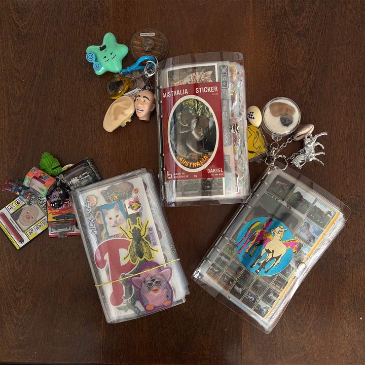 シール帳の購入先:アマゾン「ちょっとファニーなシールが大好きで、見つけるとつい購入してしまいます。最近はシールにハマりすぎて、自分のブランドでもつくりました(見開き写真右)。シール帳は、キャラクター、動物、変わったものに分けて3冊使っています。貼るときはキャラ別にしたり、色別にしたり、自分の好きなものしか貼らないページにしたり……感性を大切にシール帳を楽しんでいます♡ よく購入するショップは、100円ショップはちみせtsukiRIRI MARKETアンティークマーケットなど。癖のあるシールをいつも探しています」