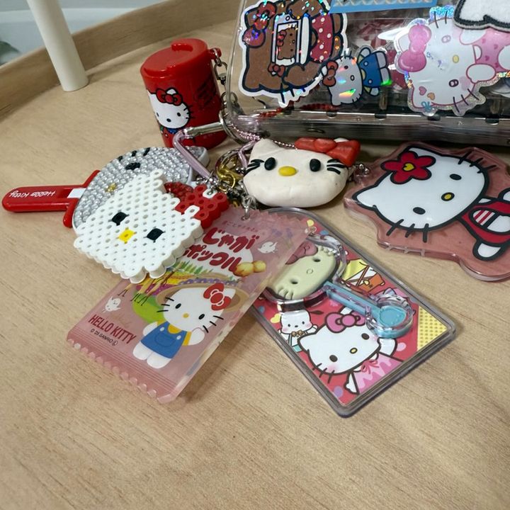 チャームはすべて〈キティちゃん〉♡ 赤の〈キティちゃん〉で統一感を出しています! ガチャガチャやお土産、子どもの手づくりなどさまざま。