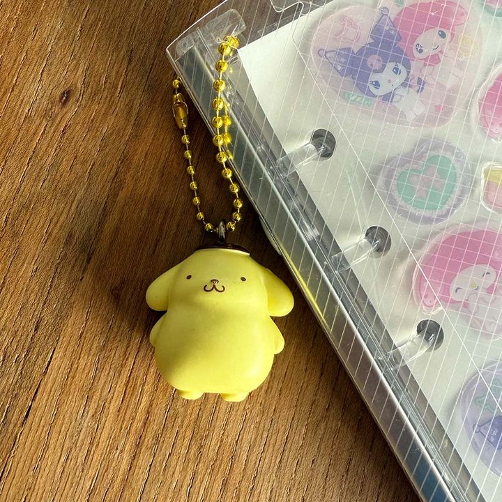 〈ポムポムプリン〉のキーホルダーはお菓子についていたもの。推しのアイドルが〈ポムポムプリン〉に似ているのでついつい集めちゃいます(笑)。