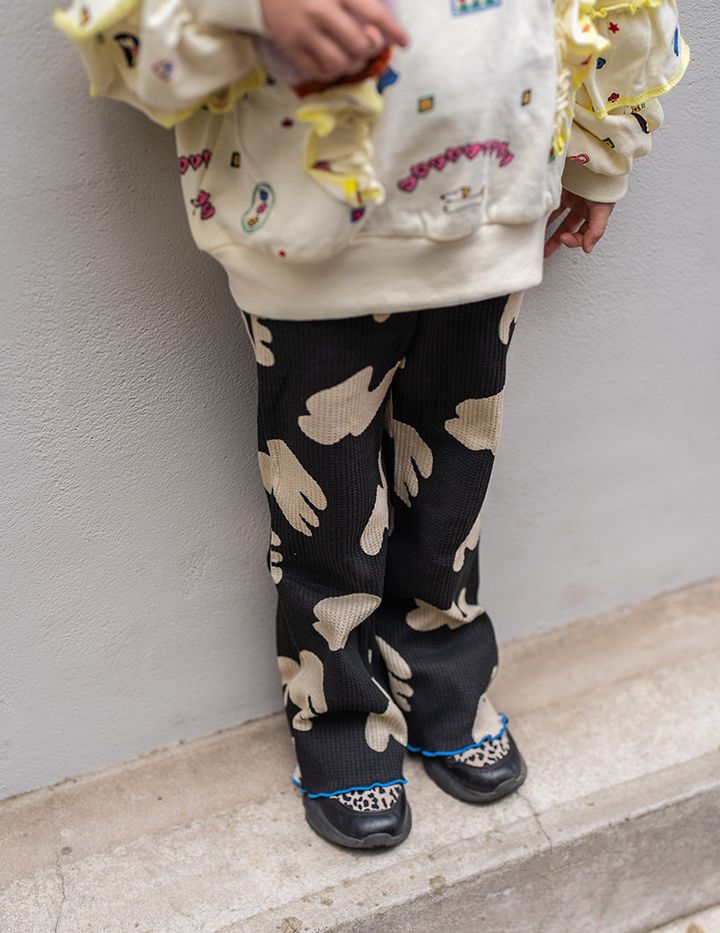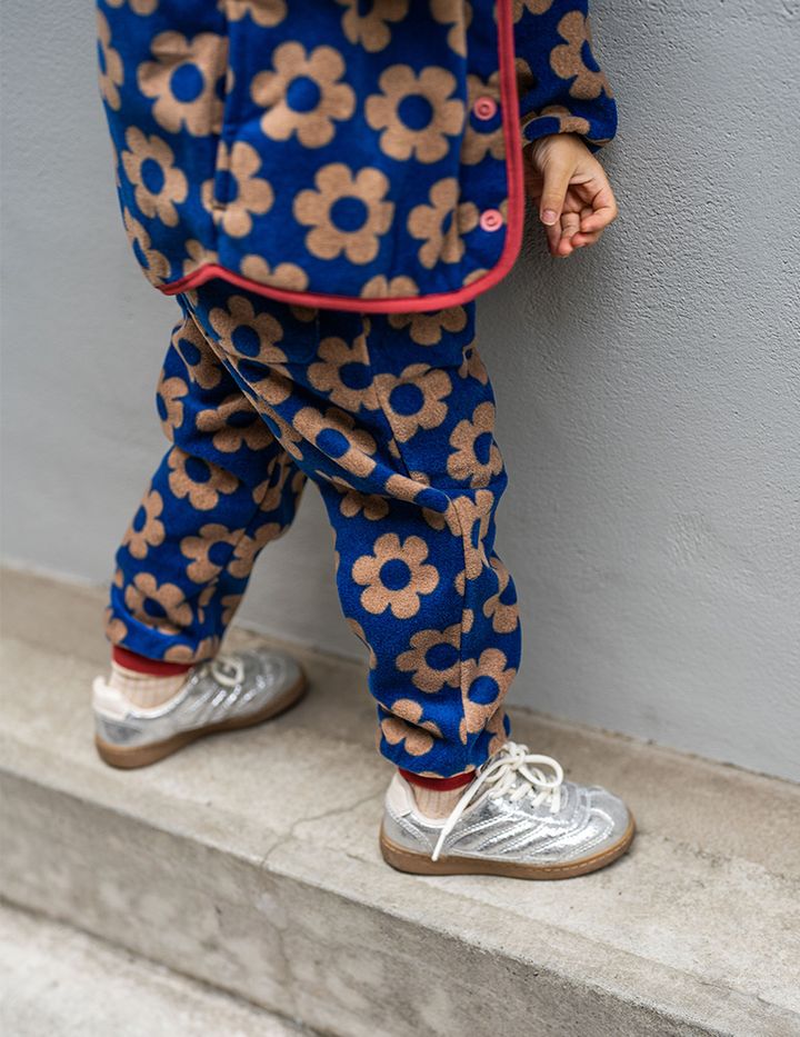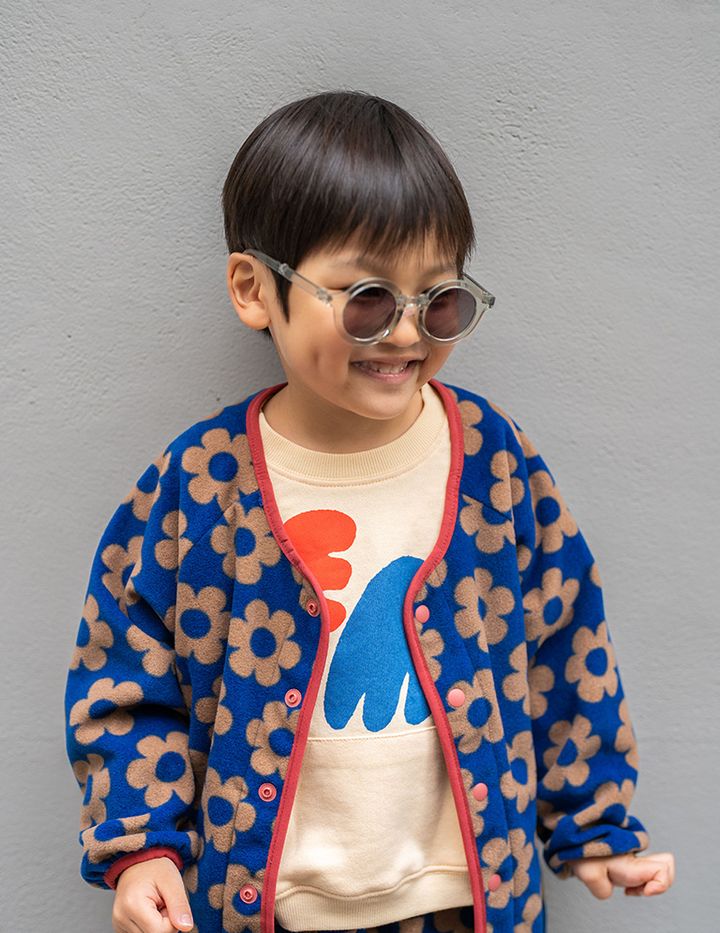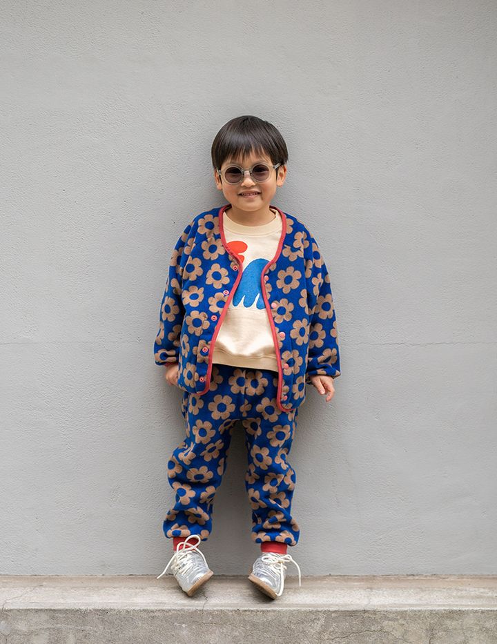 お花のところが好き。トップスの絵もお気に入り!ソウガラフリースジャケット(90~150cm)¥2,530、カンガルーポッケトレーナー(80~150cm)¥1,870、ソウガラフリースパンツ(80~150cm)¥2,090