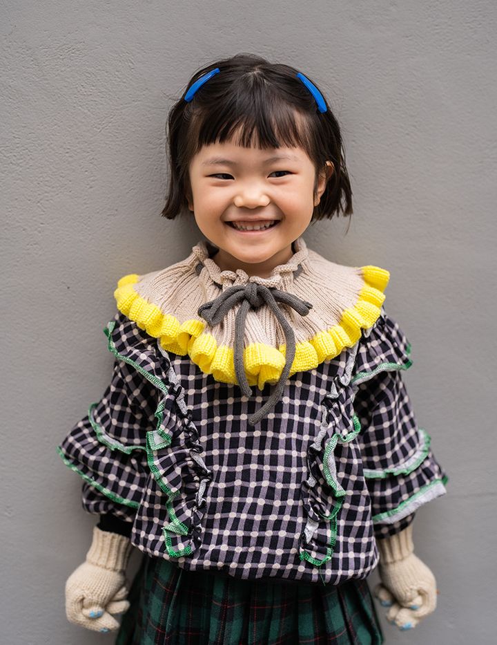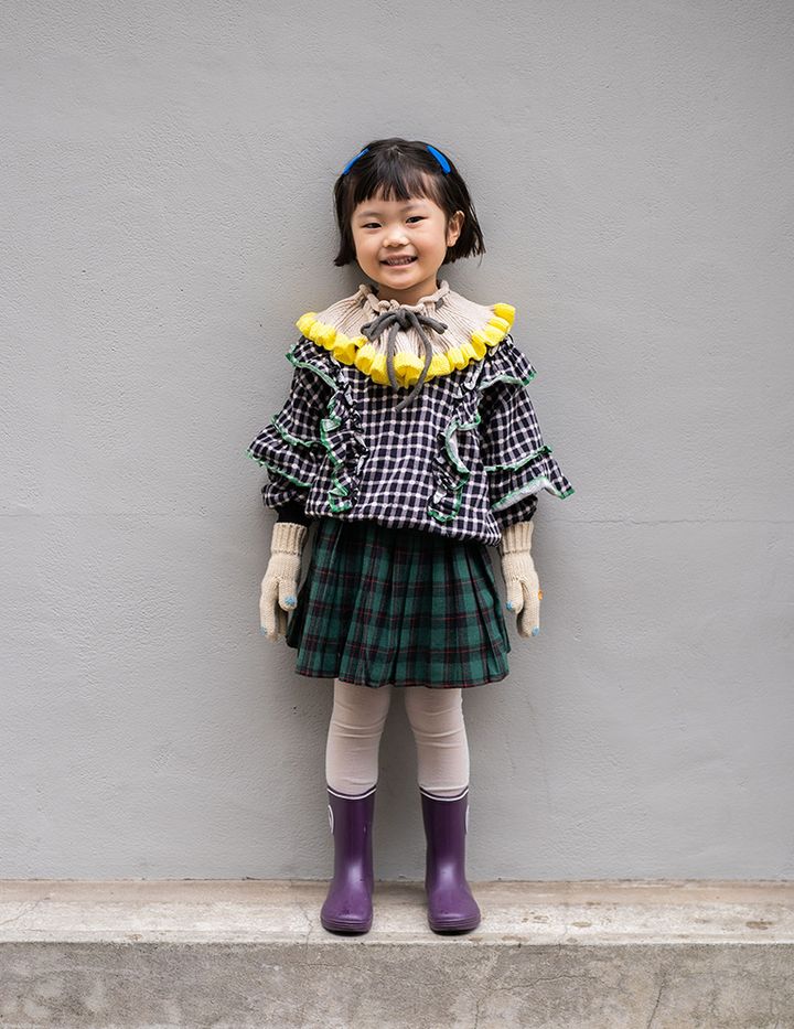 チェック柄合わせを華麗に着こなすはなちゃん♡ ビッグカラーのイエローが全体のアクセントに! マニキュアがついた手袋も遊び心たっぷり。