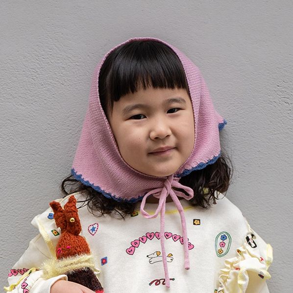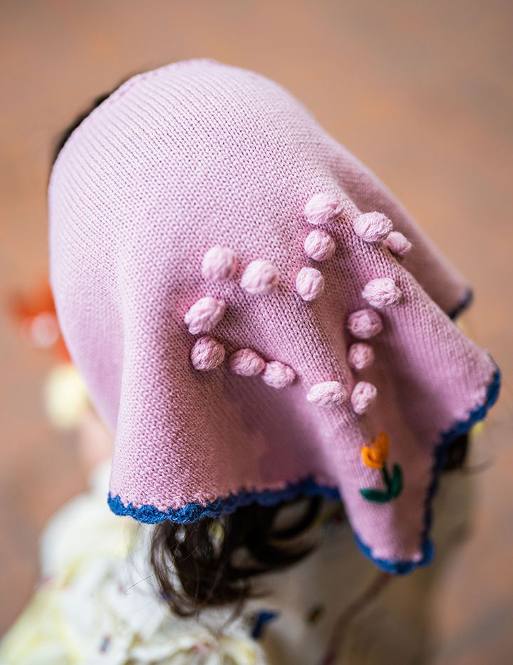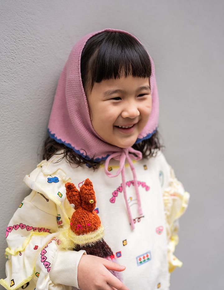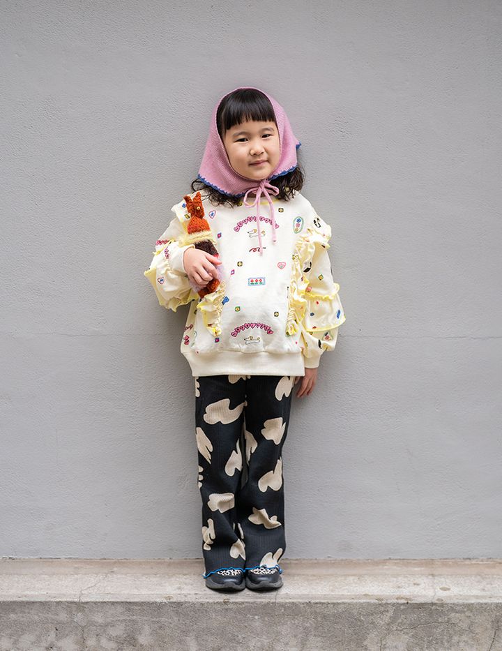 トップスのお花柄が可愛い。バブーシュカも好き!ソウガラダブルフリルトレーナー(80~150cm)¥2,310、ソウガラワッフルフレアーパンツ(80~120cm)¥1,870、【マシンウォッシャブル】ポンポンフラワーニットバブーシュカ(FREE)¥2,530