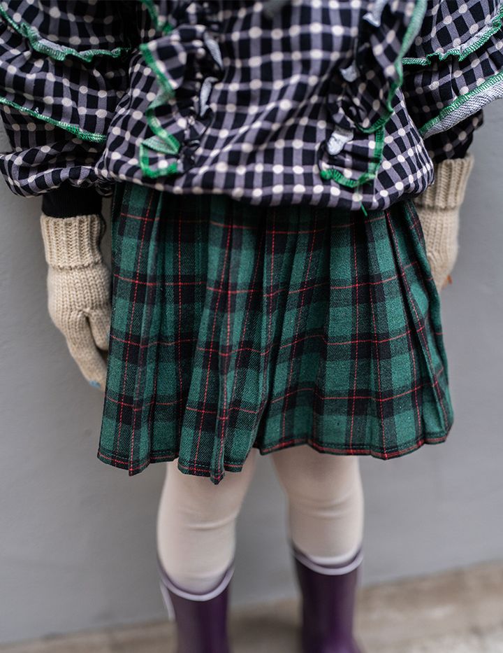 襟がいちばんお気に入り。チェックスカートと緑色も!ソウガラダブルフリルトレーナー(80~150cm)¥2,310、チェックプリーツスカート(S~LL)¥2,530、【マシンウォッシャブル】ニットフリルカラー(FREE)¥3,080、ネイル&リボン手袋(S~M)¥2,420