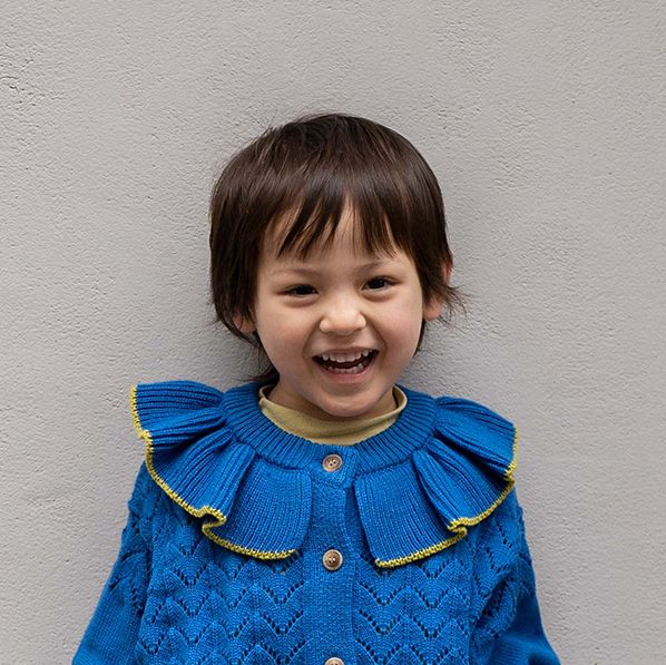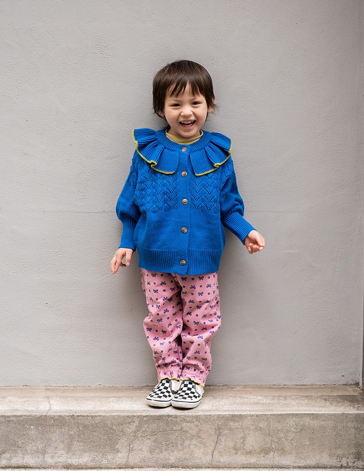 お気に入りはカーディガンの襟とズボンのリボン!【マシンウォッシャブル】フリルカラーニットカーディガン(S~LL)¥3,960、のびっとぬくっとリボンソウガラロングパンツ(80~130cm)¥2,750、