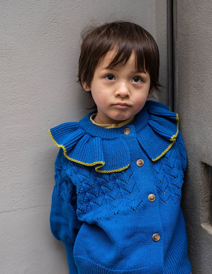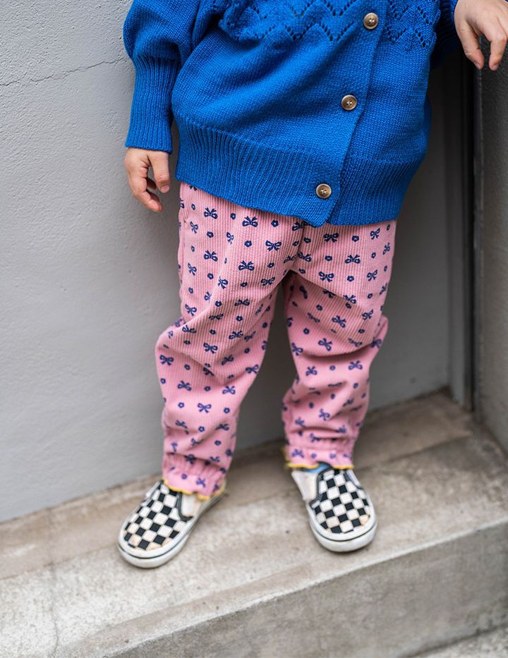 ブルー×ピンクのコントラストが存在感抜群のスタイリング。カーディガンのブルーをボトムスのリボン柄が拾っていて、配色も大人顔負け♡