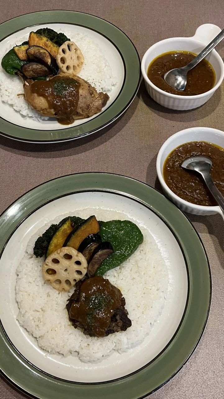 手前は「素揚げ野菜とビーフカレー」、奥は「素揚げ野菜と骨付きチキンカレー」。