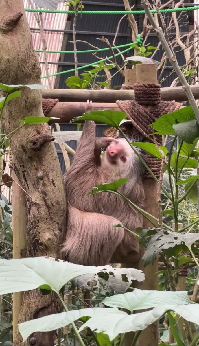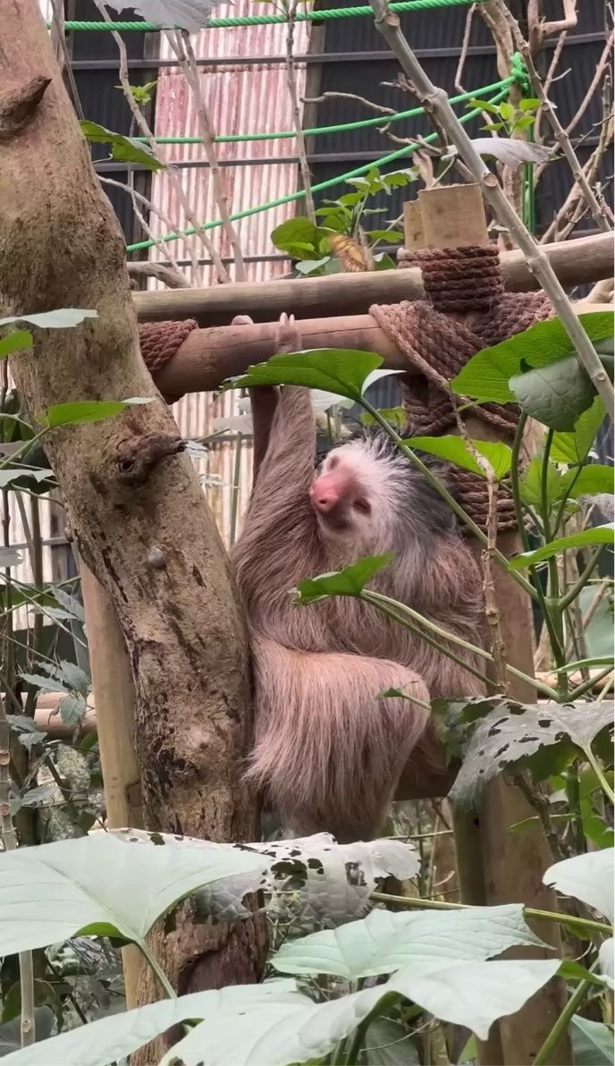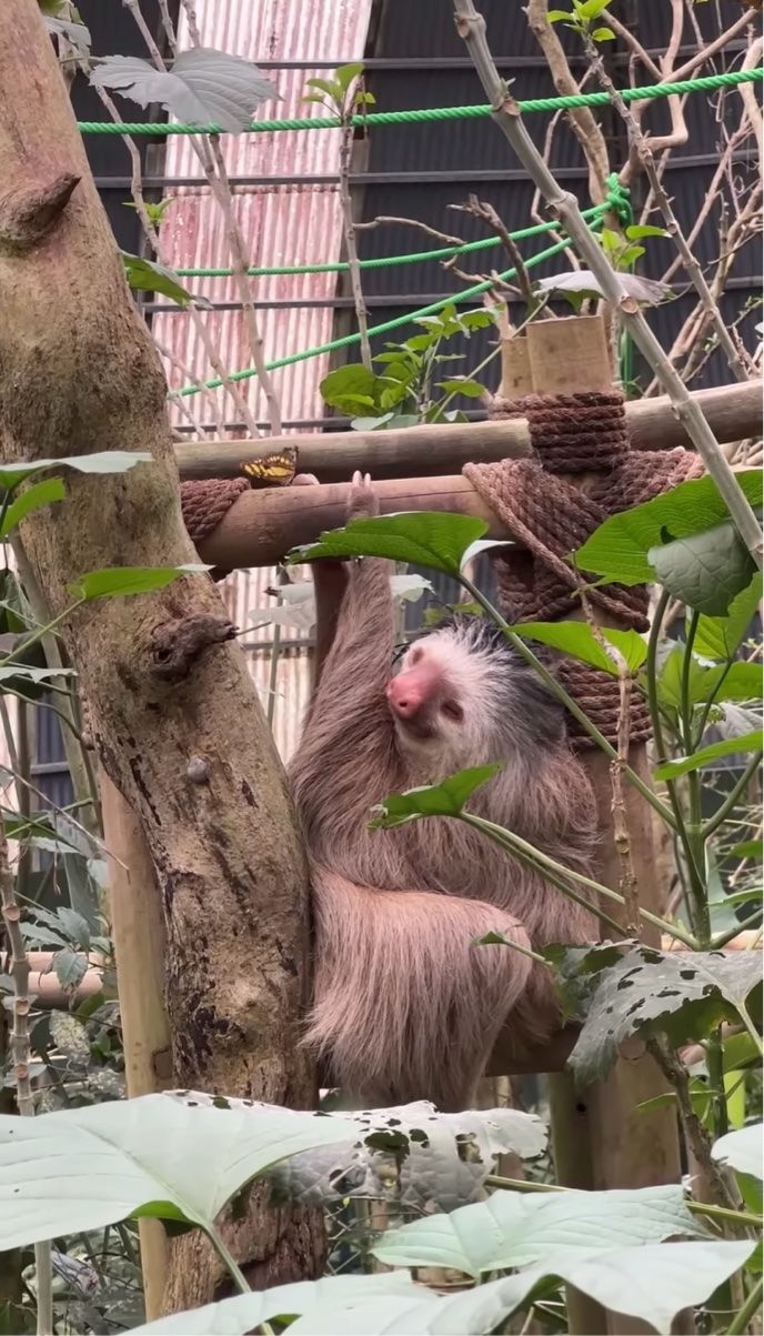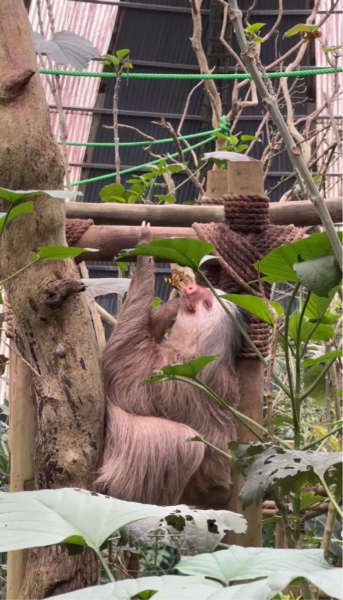 チョウのヒラヒラとした動きに合わせるように、ナマケモノもゆっくりと顔を動かします。 その穏やかな表情は、小さなお友達とのひとときを楽しんでいるようです。