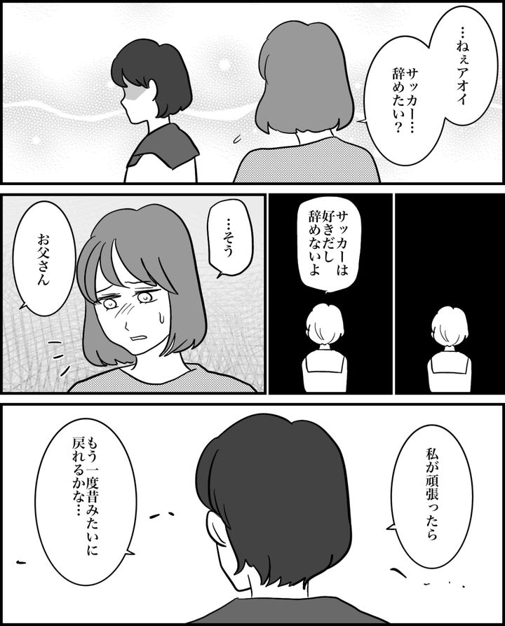 子どもたちがもう一度真剣にサッカーに向き合えば、また昔みたいに楽しく過ごすことができるのでしょう。けれど子どもたちを無視したり「死ぬ気で練習しろ」と怒鳴ったりするなんて……。アオイを激しく責めるリョウタに、私は戸惑うばかりでした。