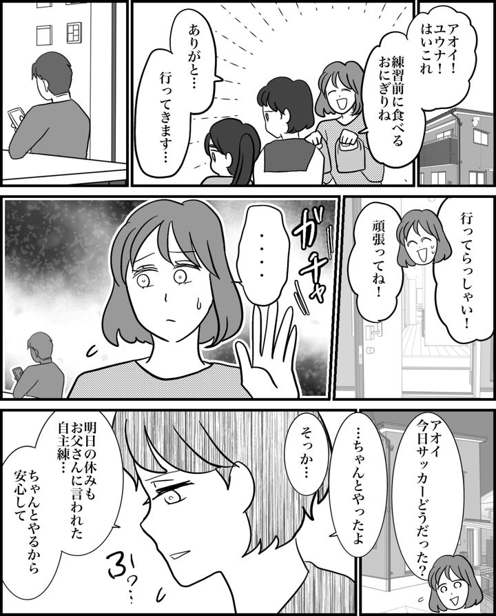 私(トモコ)は長女のアオイ(中2)と次女のユウナ(小4)を連れ、3年前にリョウタと再婚しました。サッカー経験者のリョウタは、「サッカー選手になりたい」と言う子どもたちを熱心にサポートしてくれました。しかし学年が上がると、子どもたちはサッカーへの熱意を失います。リョウタは自分自身を否定されたように感じたらしく、それから子どもたちと直接話そうとしなくなりました。同じ空間で過ごしていても無視され、冷たい雰囲気が漂います。
