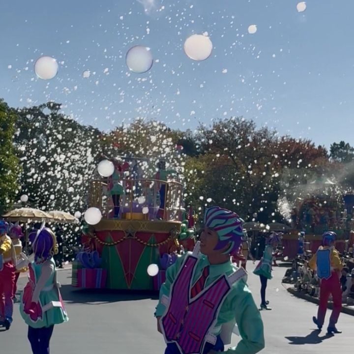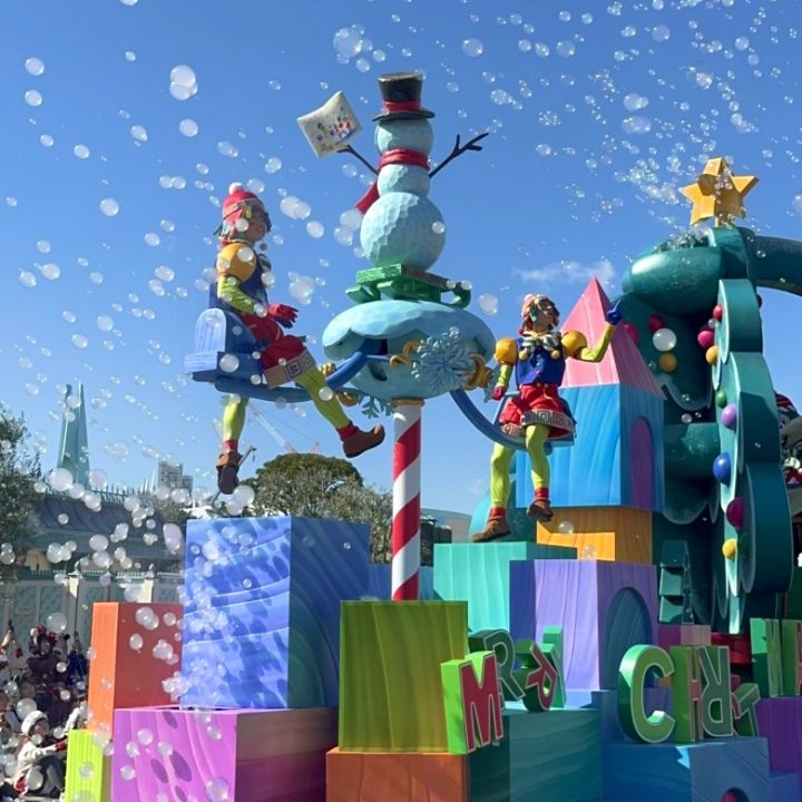 途中にゲストも一緒になって踊れるダンスもあり、あまりに楽しくて鑑賞の最中に「絶対また観たい!」と思ったくらい、私は大好きなパレードになりました♡そして、クライマックスでは舞い上がる雪のようなシャボン玉がパーク内に広がり、大盛り上がりでパレードは終了しました。
