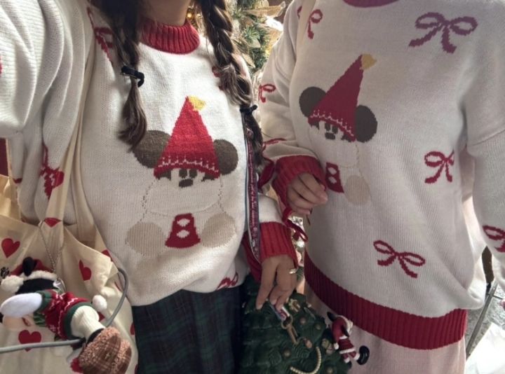 おそろいで着るとかわいさ倍増♡こんな感じで友達や家族とリンクコーデにすれば、より一層クリスマス気分が盛り上がります。ちなみに私はスカートにインして着ていましたが、peggyさんのようにアウトで着てもかわいいですよね!