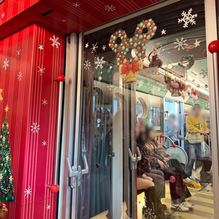 クリスマス仕様になっているのはパーク内だけではありません。パークの外周を走っているリゾートラインも一部の車両限定でクリスマス仕様に大変身♪