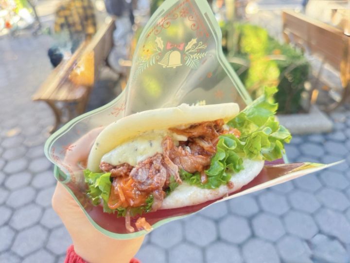 こちらはアメリカンウォーターフロントにある「ニューヨーク・デリ」で購入できるクリスマスのスペシャルメニュー。ローストビーフ、トリュフ風味のマッシュポテト、チーズをはさんだスペシャルサンドです。これがほんっっっとうにおいしかった!ローストビーフがたっぷり入っていて、にんじんのソースはサッパリとしていて食べやすく、あっという間に完食してしまいました。トリュフが香るマッシュポテトは高級感があって「クリスマスの味がする〜!」という気持ちになること間違いなし。トリュフ好きの方は、ディズニーシーに行ったら絶対に食べてほしい!定番メニューにして欲しいくらいおいしかったです。