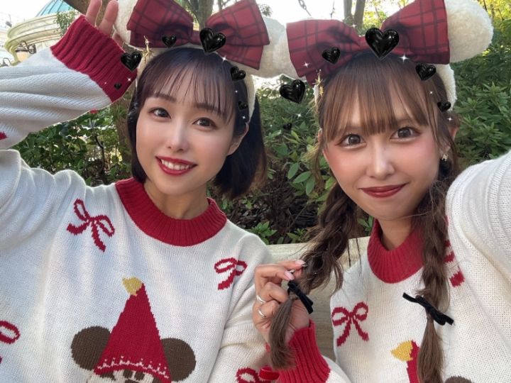 下の写真は一緒に行ったmiiさんとの2ショット。毎年発売しているクリスマス時期限定キャラクター“リルリンリン”のセーターは、今年はリボンモチーフの柄になっており、リボン大好きな私は大歓喜でした!袖にもリボンが付いていてとってもかわいいのです♡
