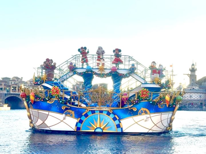 メディテレーニアンハーバーで公演される「ディズニー・クリスマス・グリーティング」には、ディズニーの仲間たちと一緒にサンタさんが登場します!(公演時間:約15分)船はオーナメントで飾られていて、曲は楽しいクリスマスソング♪「今年もクリスマスがやってきたー!!」とクリスマスを肌で感じることができました。