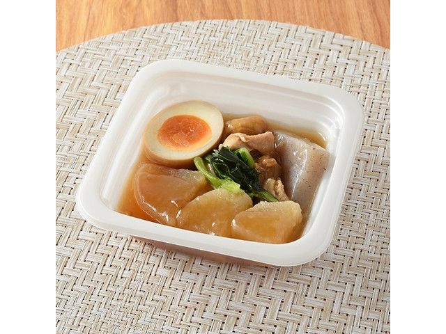 鶏・かつお・昆布のだしを合わせた、だしがしみわたる鶏大根です。こんにゃく・小松菜・味付けたまご入りで、大根の旨みが全体に広がる味わいです。 ※宮崎県、鹿児島県では取り扱いがございません。