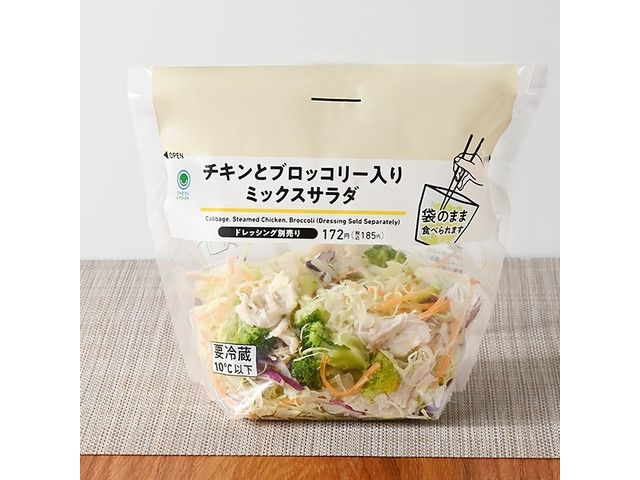チキンとブロッコリー入りのミックスサラダです。袋が自立するので、直接ドレッシングをかけてお召し上がりいただけます。ドレッシングは別売りです。 ※山梨県の一部、長野県では取り扱いございません。 ※九州地方は宮崎県・鹿児島県での取り扱いです。