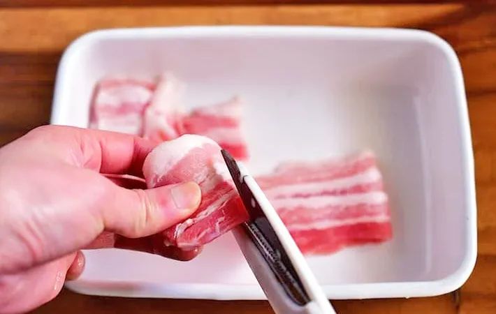 豚肉は包丁で切ってもよいですが、キッチンバサミを使うと、まな板を出さずに済むので簡単です。