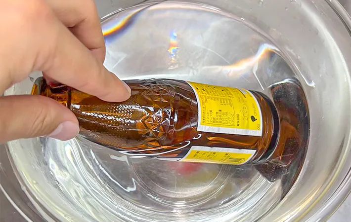 そこに、瓶のラベル全体がしっかりお湯に浸かるようにして、そのまま5〜10分ほど置きましょう。