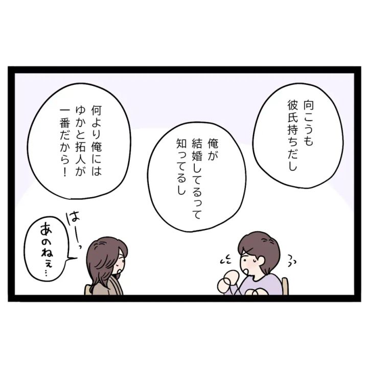 「向こうも彼氏持ちだし」「俺が結婚してるって知ってるし」「何より俺にはゆかと拓人が一番だから!」自分とレイ子の間であわよくばが起こらない理由を必死に並べるまさひで。アホすぎる弟の姿に、私は呆れた表情でため息をつき「あのねぇ・・・」と切り出します。