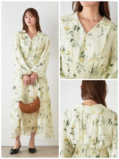 ぼかし加工のフラワープリントがリラクシーな雰囲気。身頃とスカートは軽やかなシフォンで、ふんわりしつつもウエストのシャーリングでしっかりスタイルアップ。広めに開いた衿元と大きめの衿が顔まわりを華やかに見せてくれます。春の気分を先取り♡