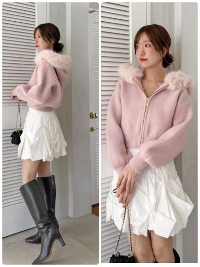 ふんわりファー付きフードが華やかで軽やかなニットパーカー。大きめのフードがポイントで、小顔効果も抜群。程よくコンパクトなシルエットで、さまざまなボトムスやワンピースにも合わせやすいデザインです。