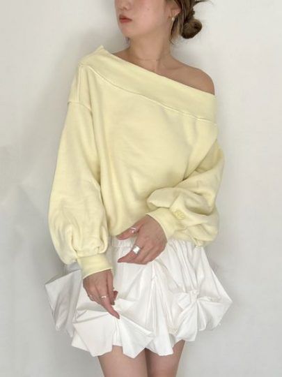 着回ししやすいスウェットトップスを女性らしく、ワンショルデザインに。袖元にはSNIDELのモチーフロゴ刺繍を配色でオン。ネック周りをリブ仕様にしているので、オフショルダーとしても着用が可能で、デコルテ見せでこなれ感あるスタイリングか叶います。
