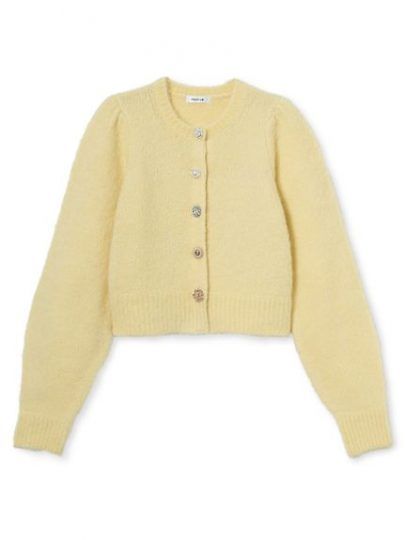 宝石のような大粒ビジューが美しいアルパカシャギーカーディガン。ひとつひとつデザインが異なるジュエリーのようなビジューは飾りボタンで、着脱はサテンのくるみボタンなので簡単に着脱できます。コンパクトなシルエット&控えめなパフスリーブは、コーディネートのバランスのとりやすさも魅力。