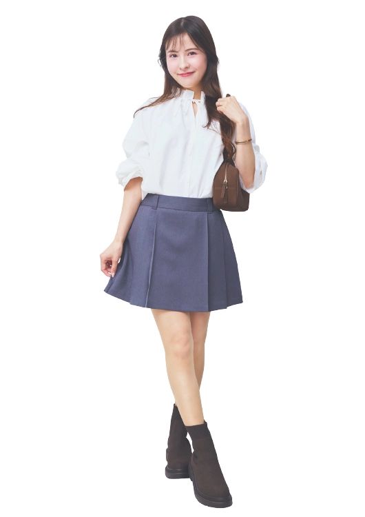「首元のリボンが可愛いのでブラウスが引き立つコーデを考えました!ボトムはスコートなのでミニ丈でも安心。スクールっぽく見えないように小物はトレンドのブラウンに統一!」(商社勤務・立川怜那さん)