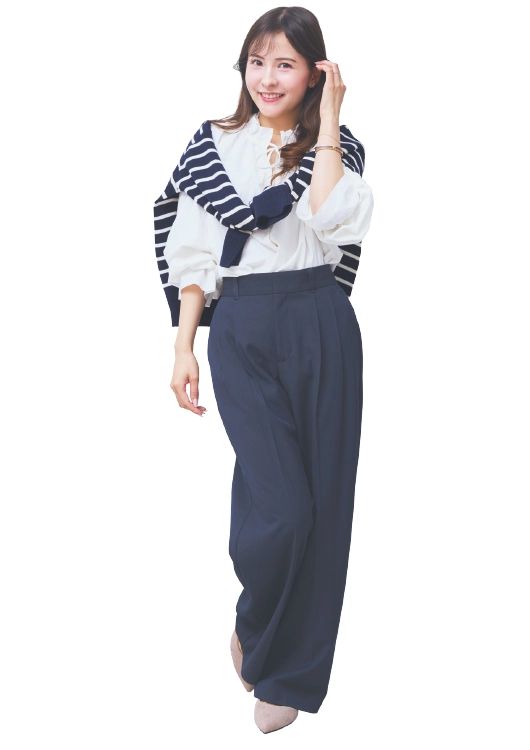 「ブラウスに、ネイビーのパンツで韓国ドラマに出てくる女優さんをイメージしたコーデに。トップスがゆったりシルエットなので、着心地がラクなのが◎。ワンツーコーデだと無難なので柄ニットを肩がけしてひと工夫しました」(商社勤務・立川怜那さん)