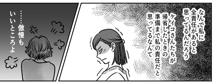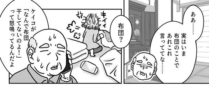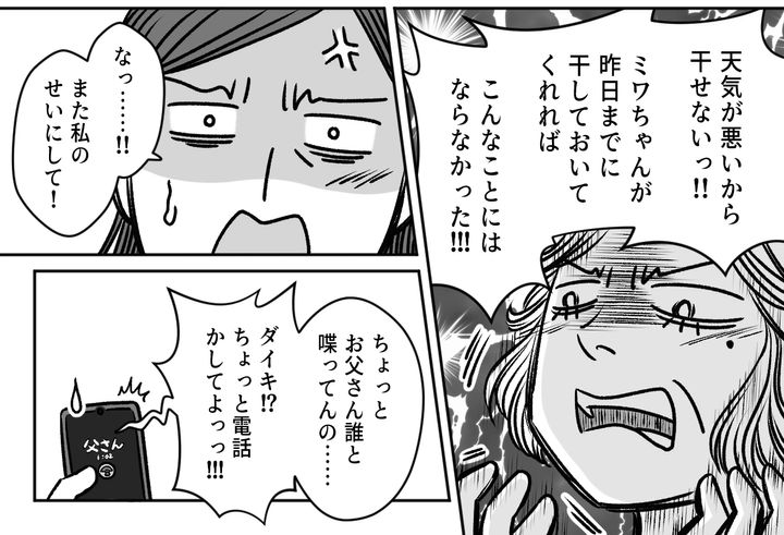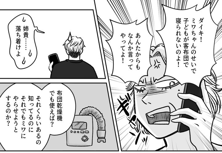 ダイキが義父に電話をすると、予想通り義父の困った声が電話越しに漏れてきます。義父の話によると、ケイコさんは客布団の用意ができていないことを、私のせいだと怒っているのだそう。その言葉を聞いた私は、呆れながらも、静かな怒りが湧き上がるのを感じました。