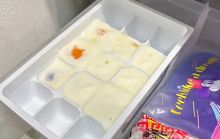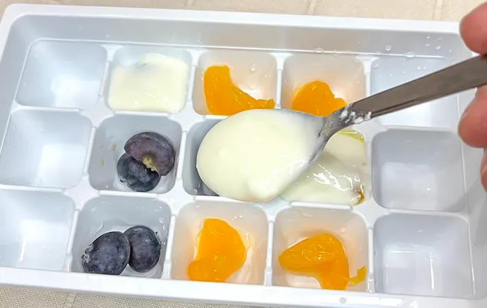 次に、ハチミツを混ぜたヨーグルトを製氷皿に流し込みます。