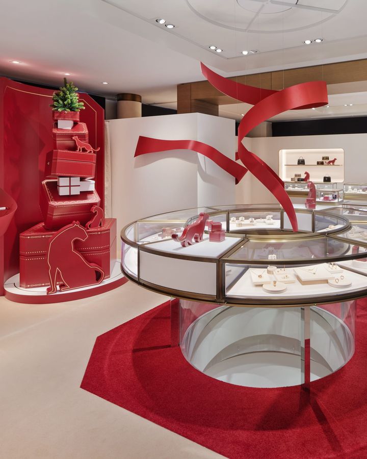 エントランスには、高さ5メートルのクリスマスツリーが設えられ、“パンテール”のオーナメントや「カルティエ」のシグネチャーである赤いリボン、レッドボックスが華やかに彩る。