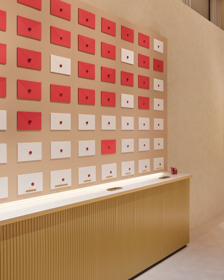 最後の部屋では、封筒を模した壁一面の引き出しからレッドボックス型のカードを選び、メッセージを添える体験を用意。さらに、20種を超えるフレグランスバーから選んだ香りをまとわせることで、パーソナルなギフトが完成する。