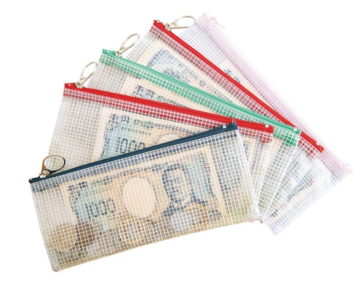 食費は月初めに100円ショップで買った5つのポーチに分ける。1つに1週間分、千円札6枚。