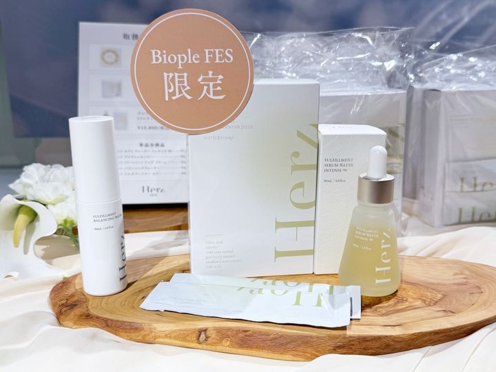 くみっきーこと舟山久美子さんが立ち上げた「Herz skin」のブースで見つけたのは、大人気で公式ECサイトでも完売が続いている「フルフィルメント フルボブースター ゼリー」です。ブランドを代表する導入美容水「フルフィルメント セラム ウォーター インテンス90」とセットとなって販売されていました。