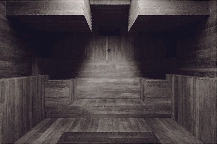 高さ約10メートルに達する《ROOM》の天井部分。この空間の体験は写真だけで捉えきれるものではなく、言葉に収めることも容易ではない。イメージとして消費されることを前提とせず、この場に身を置くことで初めて立ち上がってくる感覚がある。Room, Beaumont Hotel, London, 2014, external skin: 8mm thick stainless steel with original mill scale finish, internal cladding: dark fumed oak, 1006 × 650 × 790 cm. Permanent installation, Beaumont Hotel, London. Photograph by David Grandorge Hearst Owned
